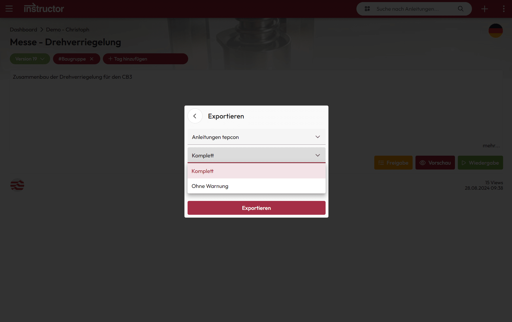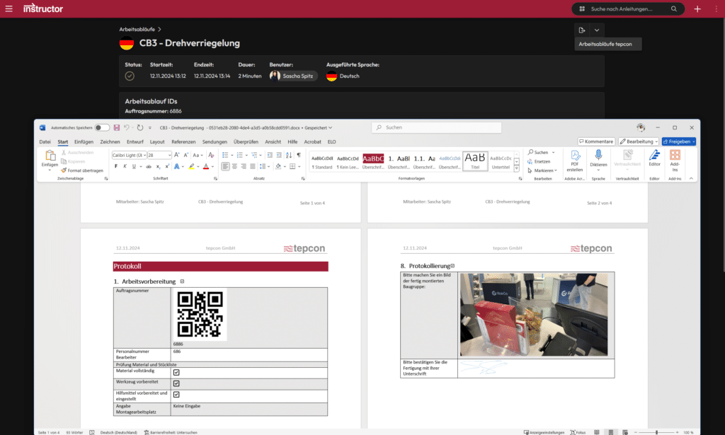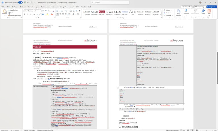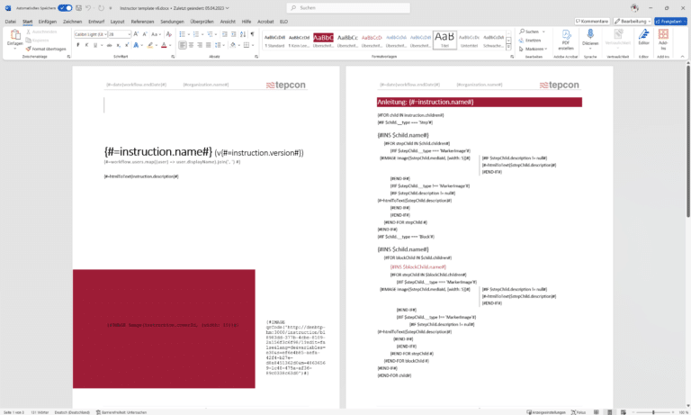 Content can be dynamically integrated by inserting variables and code. When exporting, these are replaced by the corresponding instruction content. – This means that the layout and format can be customized and perfectly adapted to existing documentation standards.